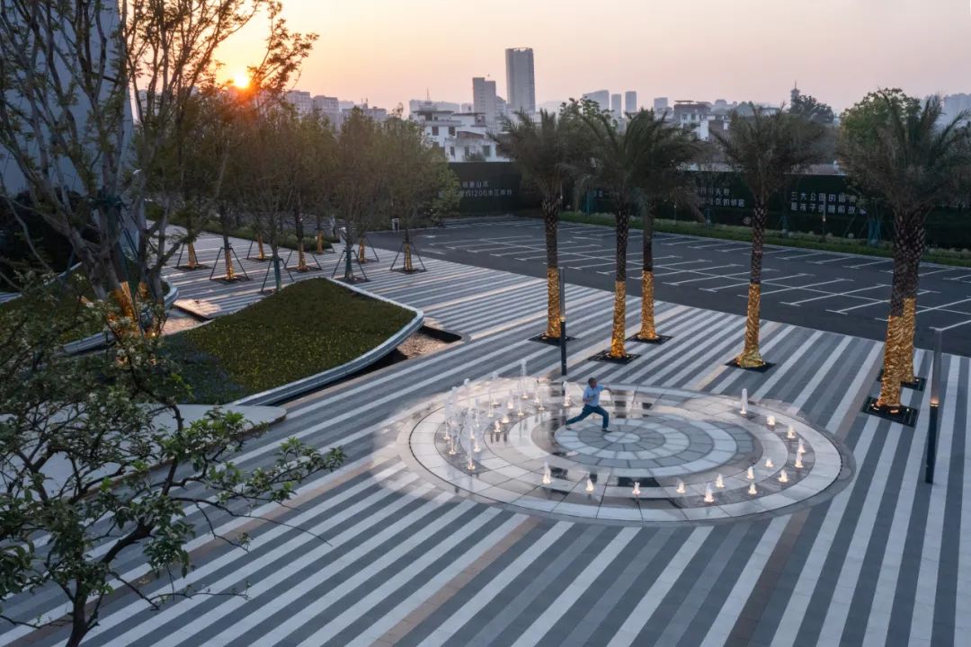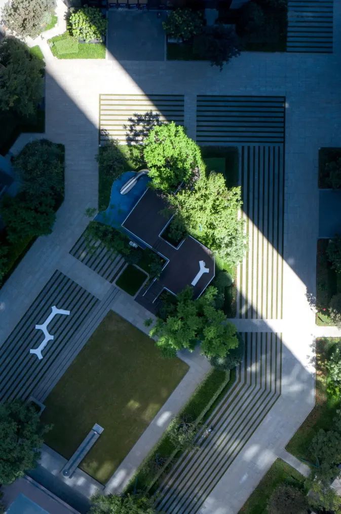 线性铺装镶嵌草坪形成简洁的图案,是我们应对景观空间被消防登高面包围的策略。
